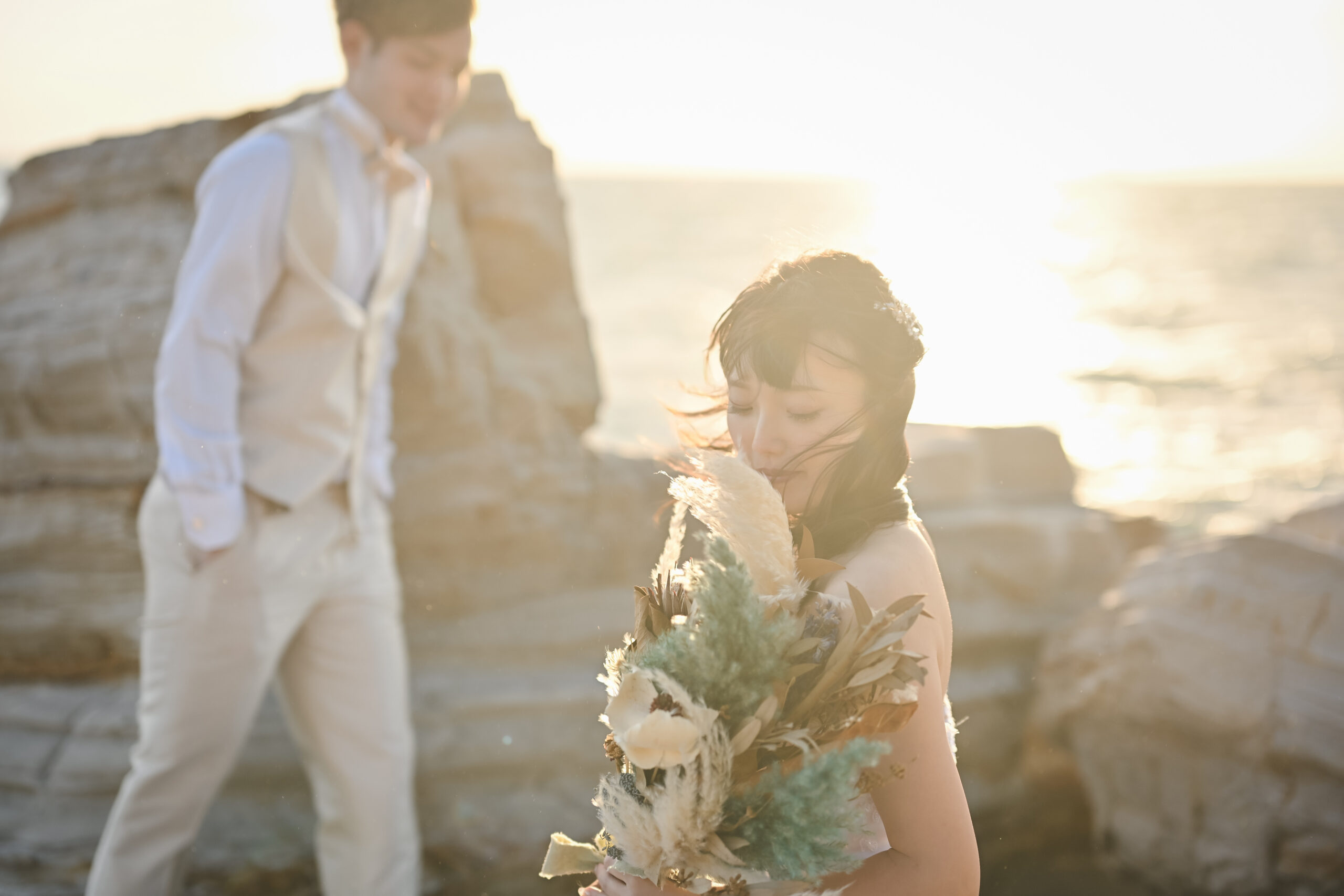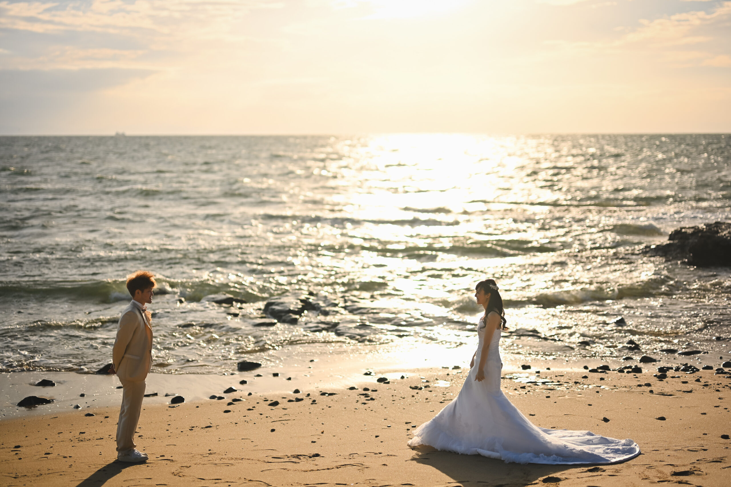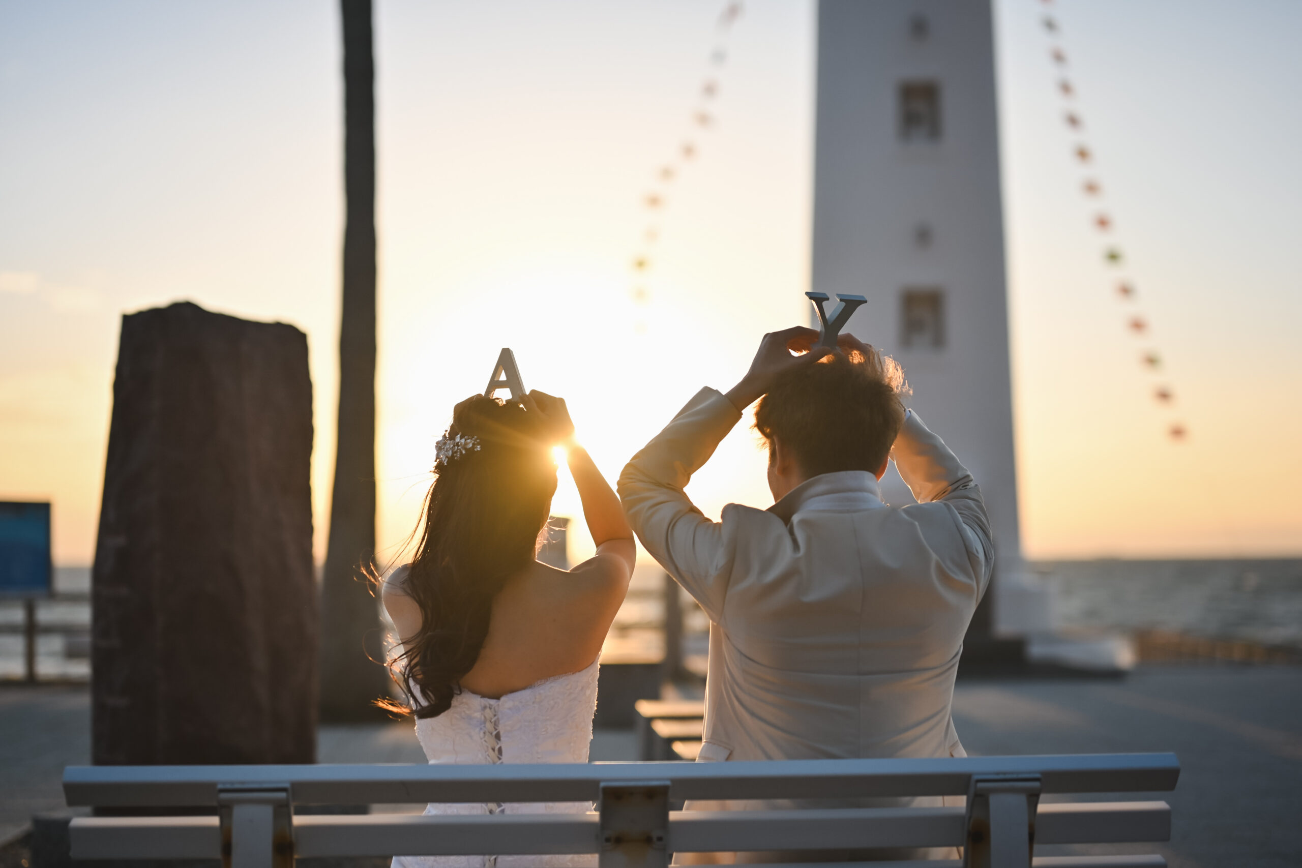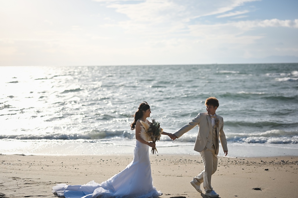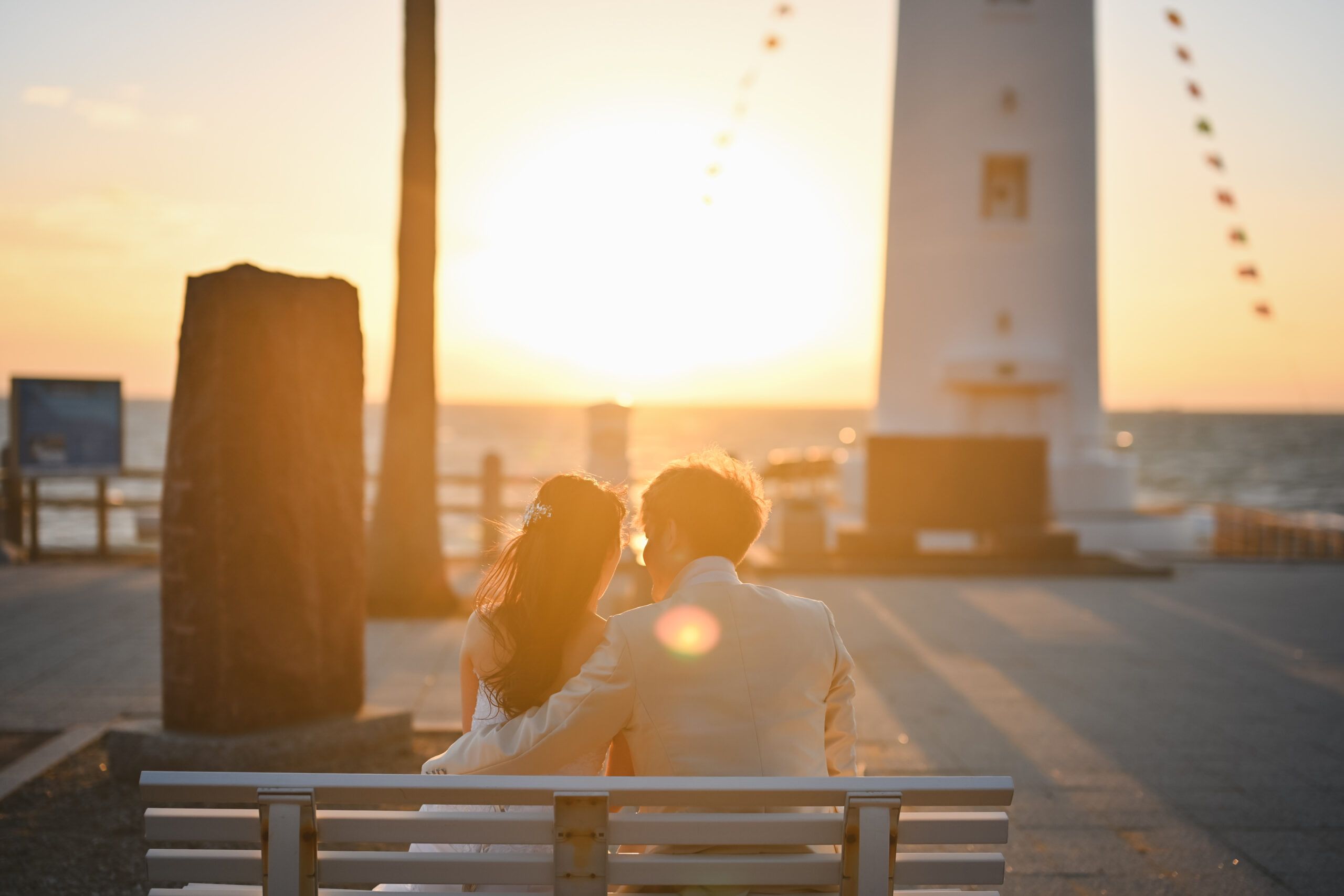 おふたりの自然体な笑顔がとても印象的で、スタッフ一同とても癒されながら撮影させていただきました。特にサンセット撮影では、やわらかな夕焼けに包まれた幻想的な雰囲気の中、内海ならではの美しい景色を残すことができたのではないかと思います。