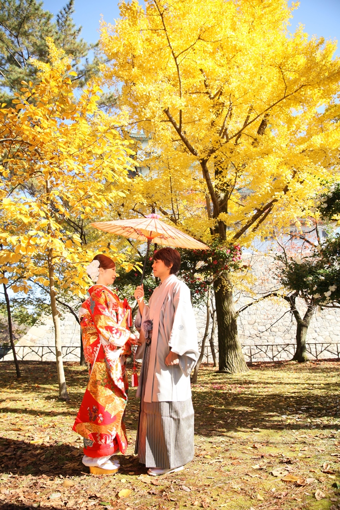 清楚な洋髪と正統派な綿帽子と、同じ衣装でもガラッと雰囲気が変わりましたね。天気も良く、真っ赤に色づいた紅葉が鮮やかで、名古屋城の外で撮った写真もキレイでしたし、